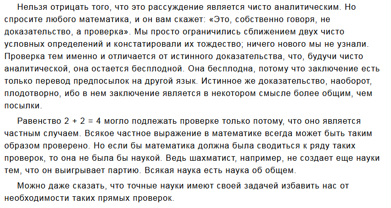 Нельзя отрицать того, что это рассуждение является чисто аналитическим. Но спросите любого математика