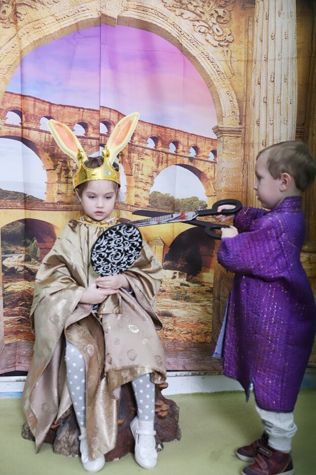 К каждому театрально-игровому занятию мы, педагоги, готовимся заранее, создаем либо приобретаем костюмы или их элементы, нужные атрибуты, придумываем декорации. Многое делаем сами. Последнее время стали использовать фото-шторы размером примерно 2,5 на 2,5 метра с различными изображениями, как природы, так и архитектуры. Их мы вешаем на стену, на фоне которой играем в нашей Комнате сказок.