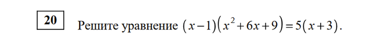 Задание 20 это алгебраическое задание, которое позволяет легко набрать баллы на хорошую оценку. Если вы знаете как решать простейшие уравнения или неравенства, знакомы с основными формулами и методами разложения многочленов на множители, то задание считается простейшим. Сегодня рассмотрим задание, которое предлагалось решить на тренировочной работе во второй части. Подробный ход решения смотрите после картинки. Хотя я не сомневаюсь, что у вас все получится и без моего решения ;) Если вы вдруг решите раскрыть скобки в левой части, то уведите, что это уравнение третей степени (старшая степень многочлена получится "куб"). Такие уравнения лучше решать методом разложения на множители, если это возможно. А возможно ли это? Надо заметить, что второй множитель представляет из себя полный квадрат. Собираем по формуле. И конечно оставляем справа нуль. Теперь видим разность двух произведений с одинаковым множителем. Вынесем этот множитель за скобки. Упрощаем второй множитель. Раскрываем скобки