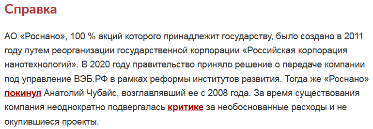 С 2008 года и до декабря 2020-го года руководителем "Роснано" был известный государственный деятель, экс-министр финансов РФ, экс-глава администрации президента (Бориса Ельцина), экс-вице-премьер федерального правительства Анатолий Чубайс.