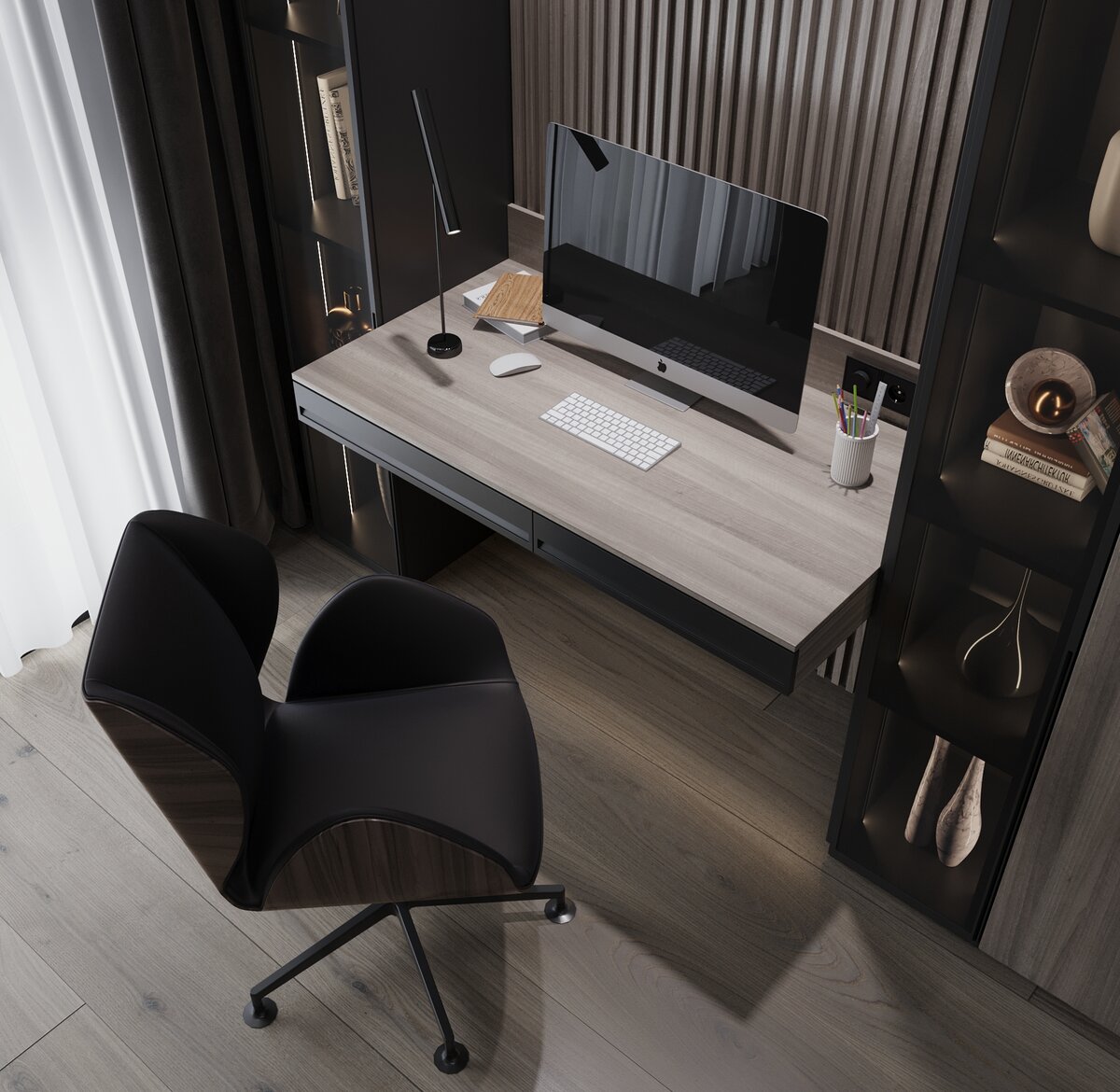 Независимо от площади помещения ваш домашний кабинет может быть удобным и функциональным при правильном планировании пространства. Шаг 1. Подходящее место Лучше всего выделить отдельное помещение для кабинета. Даже если комната небольшая, в ней вполне можно разместить все необходимое для комфортной работы. Если вы принимаете дома клиентов или бизнес-партнеров, то кабинет стоит расположить подальше от приватной части дома. Рабочую зону также можно разместить на балконе или лоджии. Разумеется, балкон должен быть утепленным и застекленным, оснащенным кондиционером и жалюзи. Чтобы зимой спасаться от холода, а летом от жары. Необходимо заменить остекление на теплое, утеплить пол, стены, потолок, тогда на балконе будет также тепло, как в комнате. Шаг 2. Рабочий стол Если вы решили разместить стол параллельно окну, то позаботьтесь о шторах и жалюзи. Так вам будет легче контролировать интенсивность дневного освещения, а нагрузка на глаза будет не слишком велика. А вот садиться спиной к окну