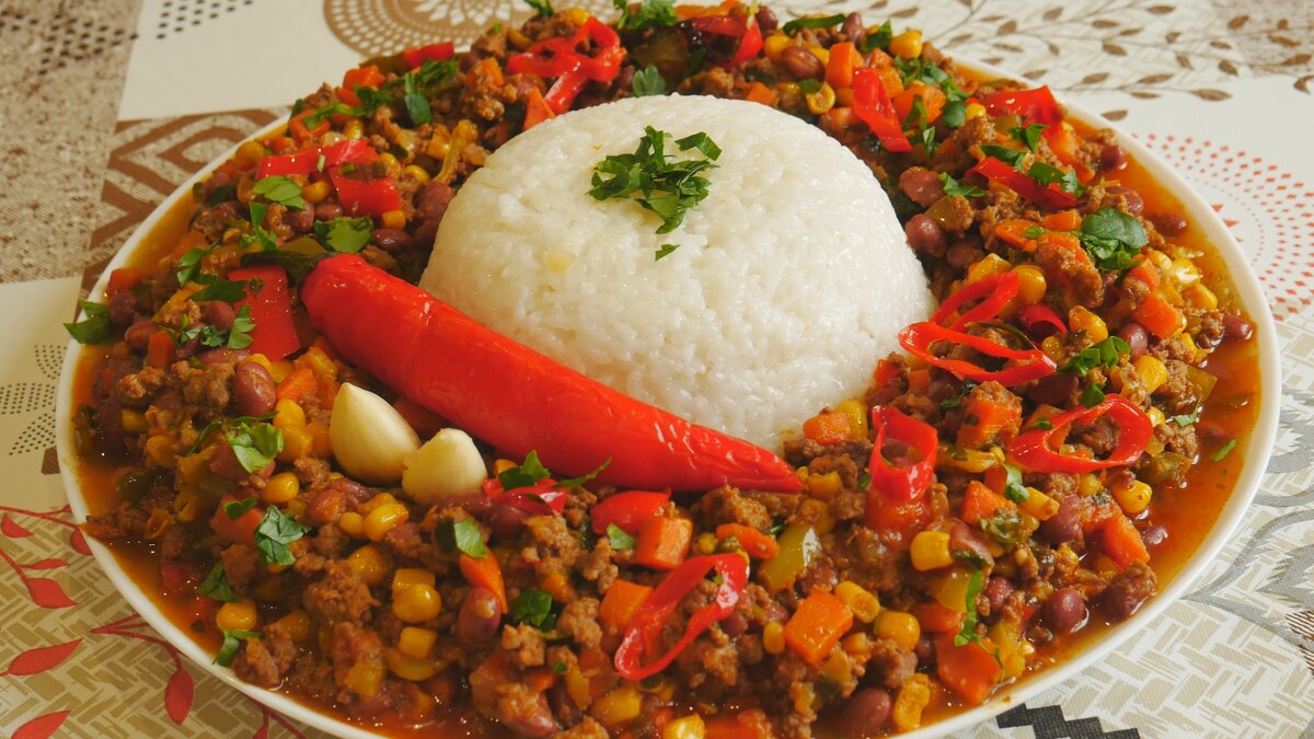 Продукты:Фарш,лук,морковь,болг.перец,перец чили,чеснок,кукуруза,фасоль,раст.масло,соль,перец,кориандр,зира, имбирь. Ставлю казан на плиту.Наливаю растительное масло и жду,когда нагреется.Первым в казан кладу перец чили и чеснок.Обжариваю минуту. При обжарке перец чили и чеснок ароматизируют масло.Добавляю лук,нарезанный кубиком и готовлю 3 минуты. Следом идет морковь.В это блюда все овощи нарезаем мелким кубиком.Морковь хорошо обжариваю т.к. она при обжарке придает блюду оранжевый цвет и вкус отличный...Жарим,парим,мы кухарим! Пришла очередь фарша,у меня говяжий.Кладу и хорошо обжариваю. На этом этапе добавляю соль,перец,кориандр,зиру,имбирь.Со специями готовлю минуту,чтоб фарш имел более яркий вкус... Кладу протертые помидоры и держу 3 мин.На этом этапе можно было добавить 1 ст.л. сахара. Но,т.к. я буду в блюдо добавлять сладк