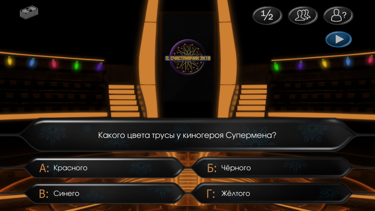 Так какого же цвета трусы у киногероя Супермена? Уже догадались, какой ответ является правильным? Даны варианты ответов: "Красного", "Черного", "Синего", "Желтого". Правильный вариант ответа – А(Красного). У киногероя Супермена трусы красного цвета. Здесь появляются скриншоты из игры для смартфонов "О счастливчик 2k19". Ссылка на скачивание игры: https://play.google.com/store/apps/details?id=com.onemillionairetrivia.m2K20. Друзья, это ссылка на последнюю версию игры. Игра "О счастливчик 2k19" недоступна в Google Play Market, зато она есть в App Store. На моем канале представлены скриншоты вопросов из игры "О счастливчик 2k19", а также развернутые ответы на эти вопросы. Сначала идет вопрос, затем - развернутый ответ на него. Добро пожаловать в интеллектуальный клуб. Друзья, буду рад, если вы присоединитесь к моему сообществу во "Вконтакте". Ссылку на сообщество можно будет увидеть в конце этой статьи. В моем сообществе во "Вконтакте" гораздо больше информации, чем здесь. Супермен – супе