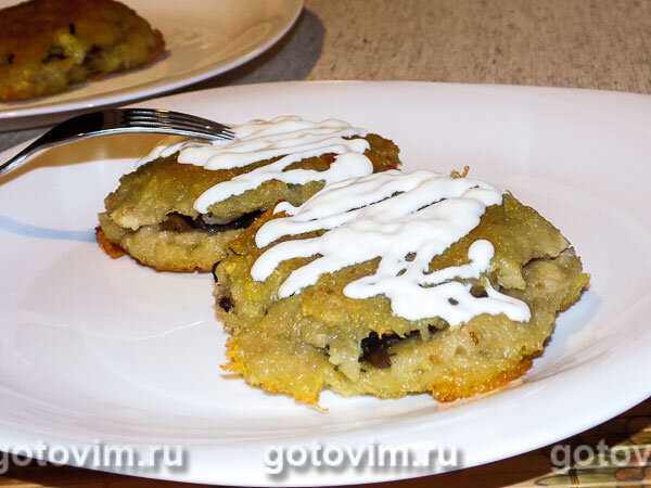 - На уже разогретую сковороду, в которой кипит растительное масло, выложим аккуратно ложкой картофельное тесто. Сверху положим грибную начинку. Накроем слоем картофельного теста. Уменьшим нагрев до минимального. Сначала минуты 3-4 жарим оладьи с одной стороны, потом их следует очень аккуратно, чтобы не развалилась начинка, перевернуть на другую сторону. Можно начинать пробовать.