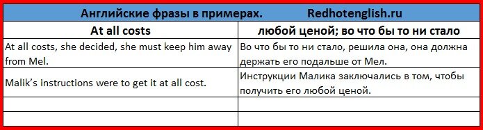 Разбираем значения английских фраз на реальных примерах. Четвёртая часть подборки. Ссылку на предыдущие 3 части оставлю в конце. Нумерацию продолжаю сквозную, то есть самые часто используемые словосочетания были в первом выпуске, а сейчас уже более редкие. 16. at all cost - любой ценой; во что бы то ни стало В прошлой статье мы рассматривали фразу "at all", которая означает "совсем, вообще", здесь же фраза похожая, но значение совсем другое. Если переводить дословно, то all - весь, все, cost - стоимость, цена. Так что перевод "любой ценой" почти дословный. Вот несколько примеров использования выражения: 17. at last - наконец; в конце концов Слово "наконец" по-английски можно сказать наверное десятком способов. Это один из них. Фраза в чём-то противоположна фразе at first, которая означает "во-первых". Вот несколько примеров использования из детективных романов Джеймса Хэдли Чейза: 18. in spite of - несмотря на Глагол to spite переводится как "делать назло". Так что in spite of можно до