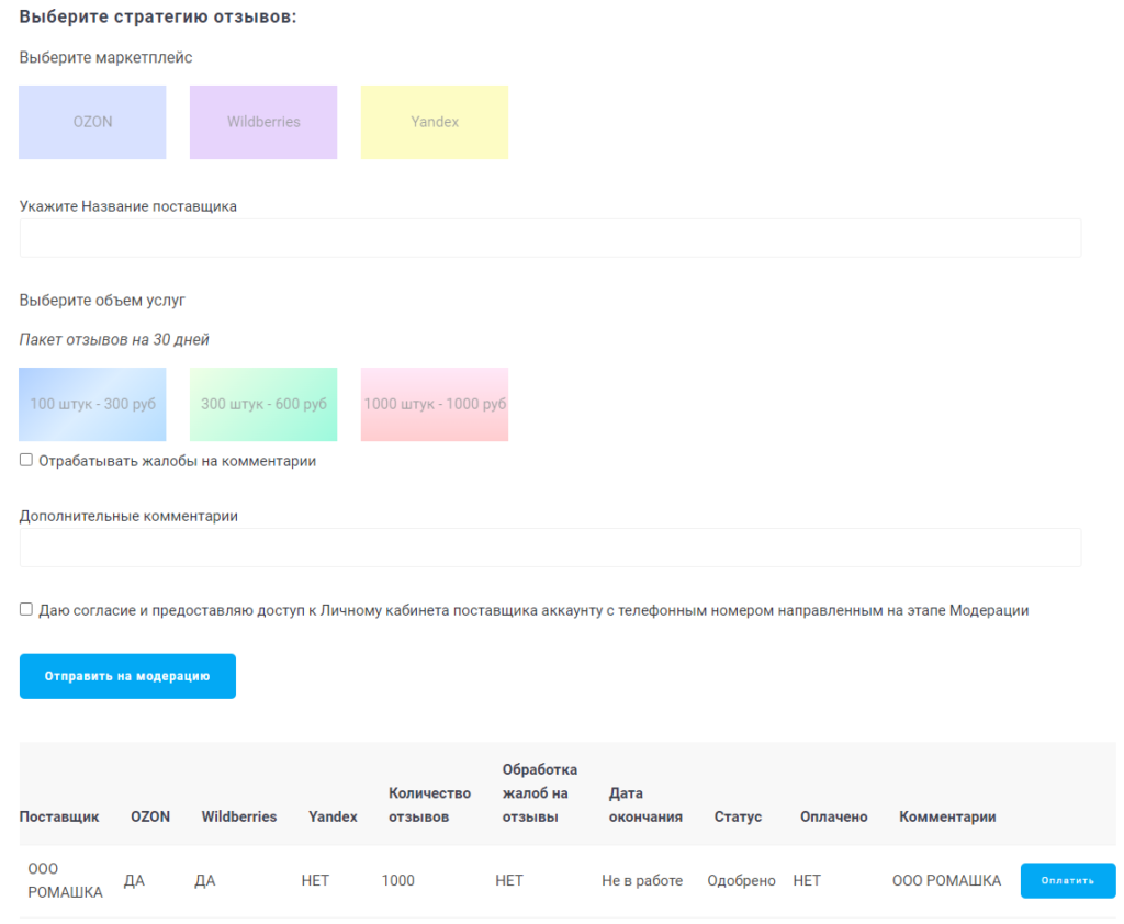 Мы создали АВТОМАТИЧЕСКИЙ сервис ответов на отзывы + БОНУС ЖАЛОБА НА ОТЗЫВ (ПОЛУАВТОМАТИЧЕСКИЙ)* — ССЫЛКА *Услуга платная 1. КАКИЕ МАРКЕТПЛЕЙСЫ И КАКИЕ ВОЗМОЖНОСТИ Wildberries OZON Яндекс.Маркет * согласовывается на этапе Модерации заказа 2. АЛГОРИТМ ЗАКАЗА ССЫЛКА НА СЕРВИС В ЛИЧНОМ КАБИНЕТЕ WBCON Интерфейс выше КНОПКА «ОТПРАВИТЬ НА МОДЕРАЦИЮ» — Ожидайте письма на EMAIL использованный при регистрации на WBCON.RU Внизу информация по заказу. ПОСЛЕ ОТПРАВКИ НА МОДЕРАЦИЮ ЗАКАЗА, ЗАПУСКАЕМ СОГЛАСОВАНИЕ И НАСТРОЙКА ТОНКОСТЕЙ. ДОСТУПЫ СОГЛАСОВЫВАЮТСЯ ПО EMAIL, КОТОРЫЙ ИСПОЛЬЗОВАН ПРИ РЕГИСТРАЦИИ НА WBCON.RU 3. АЛГОРИТМ РАБОТЫ АВТОРИЗАЦИЯ. Почему мы используем НЕ API? Потому что API обезличено!!! Предоставляя доступ по телефону/email, вы по сути всегда можете найти крайнего. Вы тем самым связываете доступ с человеком/сервисом WBCON. А мне многие из вас доверяют. Во время работы система эмулирует посещение Вашего Личного кабинета обычным человеком и для Маркетплейсов работа БОТА выглядит как по