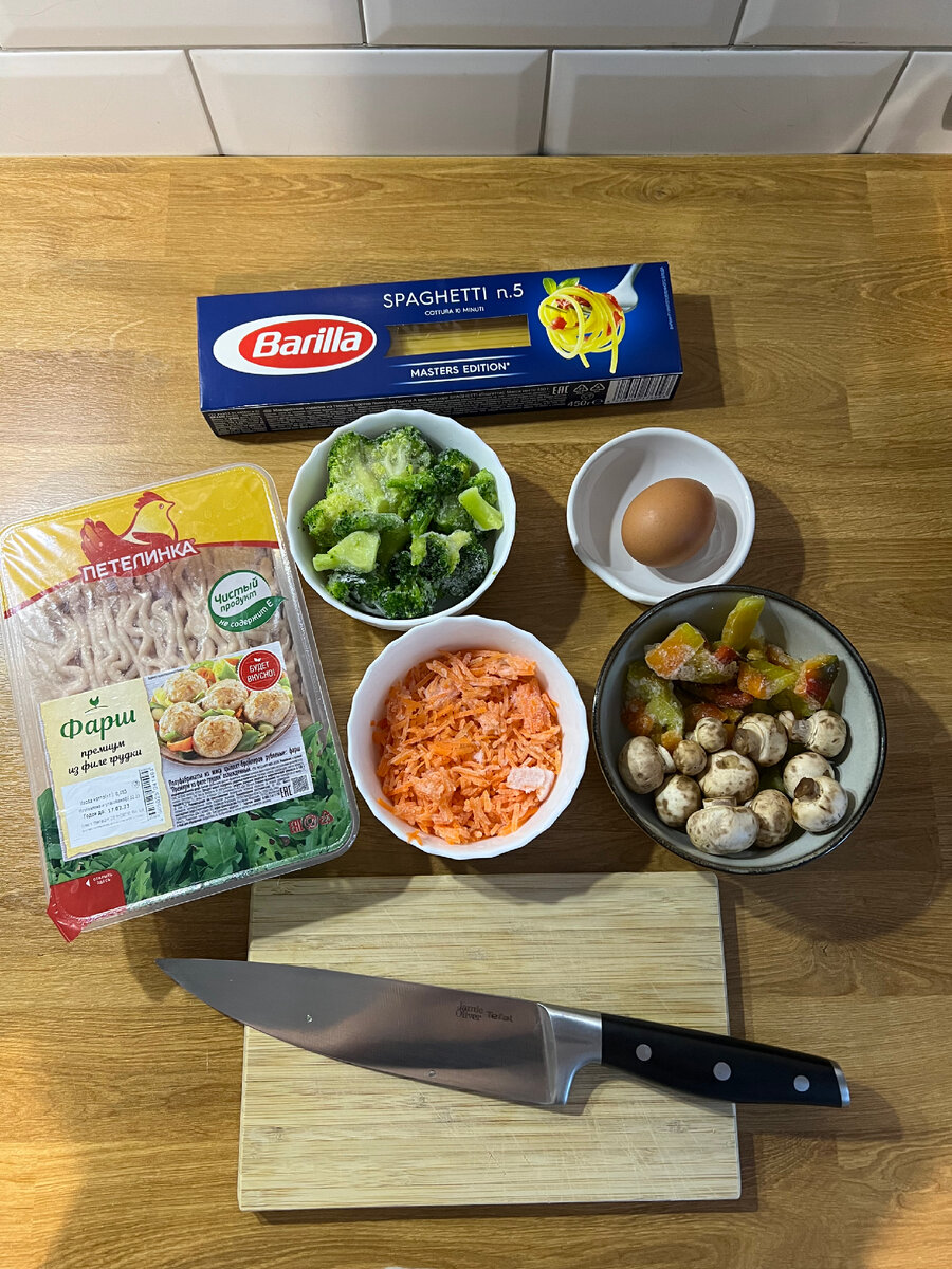 Данный ужин подойдет для всех членов семьи. Если в семье есть дети, если вы худеете и просто придерживаетесь правильному питанию В меню запеканка, мини-котлетки, и спагетти Ужин готовится за 30 минут Начинаем с запеканки. Для запеканки используем различие овощи которые Вы любите, и то что есть в морозилке. Все овощи разрезаем на удобные кусочки и смешиваем в форме для запекания В отдельной миске смешиваем 2 яйца и 100 мл молока ( можно и без него). Так же к яйцам добавляем ваши любимые приправы. Яичную смесь добавляем к овощам, перемешиваем и в духовку. Выставляем температуру 200 градусов и на 30 минут. Готовность проверяем - яйцо должно свернуться. Пока запеканка в духовке ставим разогреваться сковородку и кастрюлю с водой. Для куриных котлеток нам понадобится фарш куриный 500 гр, специи по вкусу и яичко. Все смешиваем и котлетки формировать будем ложкой, чтоб руки остались чистыми. Сковороду слегка смазать маслом. И выкладываем наши котлетки. Кипящую воду не забываем подсо