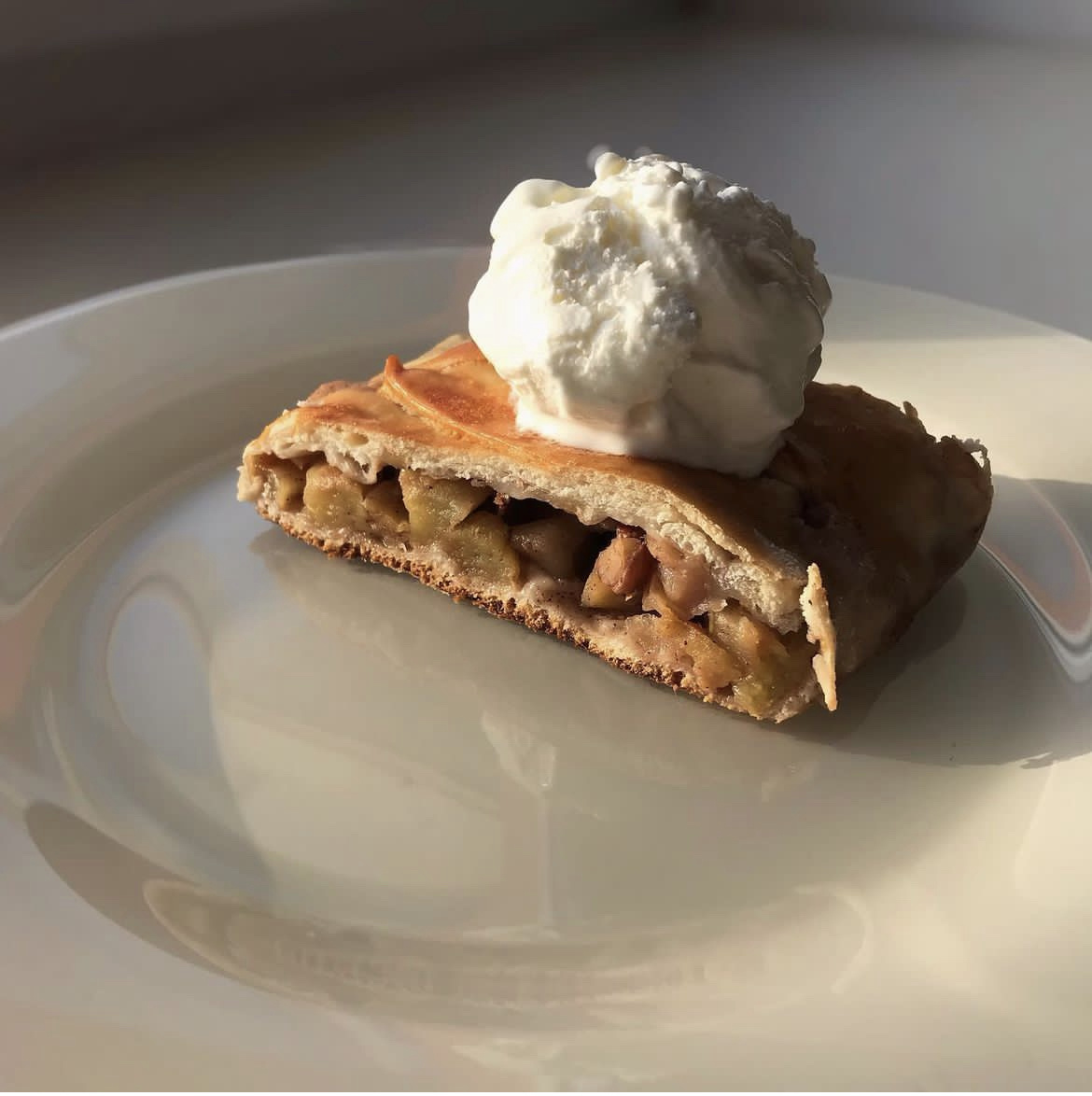 Вам понадобиться: • Яблоки • Сахар • Корица • Сливочное масло • Орехи (по желанию) • Слоенное бездрожжевое тесто А теперь полет фантазии. Специально написала без пропорций, потому что здесь все на ваш вкус. Для начинки нарежьте яблоки, обжарьте их на сковороде со сливочным маслом, сахаром и корицей, можно добавить орехи (грецкие или пекан). Раскатайте тесто достаточно тонко, выложите на него начинку и сверните в рулет. Смажет его желтком, посыпьте сахаром и выпекайте при 180 градусах до красивой золотистой корочки (минут 20, но смотрите по своей духовке). Готовый штрудель подавайте с мороженым. Приятного аппетита 💚