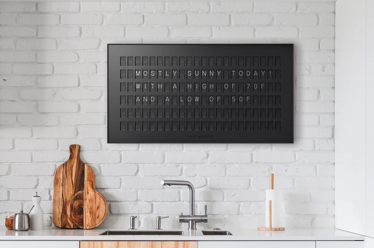 Устали от однообразных ЖК-дисплеев и панелей? Дизайнеры компании Vestaboard предлагают перенестись на несколько десятилетий назад, в те времена, когда на вокзалах и в аэропортах нас окружали черно-белые перекидные табло, мерным шуршанием возвещавшие появление на них новой информации.