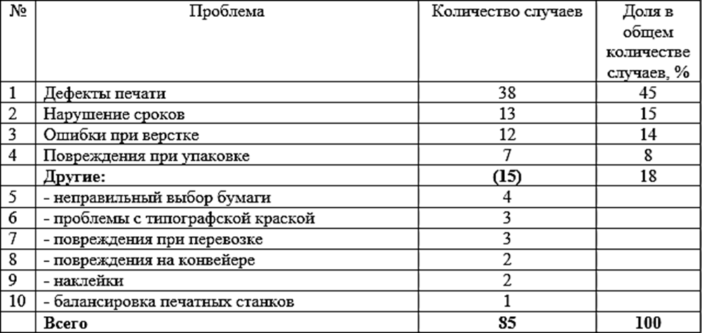 1. В результате предварительной работы группы были определены типы проблем, по причине которых типография терпела убытки, затем в течение определенного времени были собраны соответствующие данные. Все собранные данные расположили в таблице, в порядке убывания их значений:
