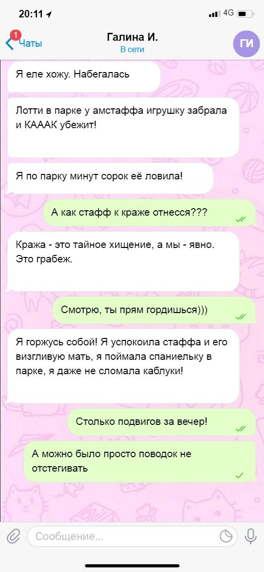 Наши собаки должны на улице с нами ходить на поводке. Маленькие или большие, в людном месте - на поводке. Но и на поводке с собакой могут случиться... приключения. А без поводка - тем более. Первая переписка о спаниельке... без поводка. Вот что пришлось пережить её легкомысленной хозяйке. Столько сил потрачено... А ведь проще не отпускать собаку в людных местах с поводка? Еще одна переписка про спокойного алабая Агату. Агата - милашка. Но и прохожих я понимаю) Эх, внимательнее надо быть при выборе карабина для крупной-крупной собаки. У меня даже немецкая овчарка карабины на раз гнула. А ведь послушная была девочка! Следующая переписка о... хаски и непослушном поводке-рулетке. А может... о хозяйке-блондинке. Решайте сами: Главное, что хозяйка Джины никогда не отчаивается: то её к дереву привязали, то Джина в кусты затащила, то, пока хозяйка в магазине была, собака сиденье в машине сгрызла... Веселая парочка. Главное, муж всегда на звонке) И напоследок переписка о французском бульдоге с