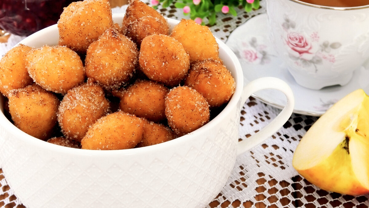 Всем привет! Сегодня давайте приготовим с вами очень быстрые пончики. В тесто для них добавляется натертое яблоко, что делает сами пончики нежными и мягкими. Пончики получаются маленькие, буквально на один укус и что самое важное не жирные. Тесто во время обжаривания не впитывает много масла и это их главный плюс. Из данного количества теста получается целая миска вкуснейших пончиков, которые вы приготовите буквально за 15-20 минут. Это очень просто, быстро и легко! А ещё очень и очень вкусно! 📝Ингредиенты *Тесто* -примерно 300 гр пшеничной муки в/с -1 яйцо -125 гр натурального йогурта без добавок -2 стол.л растительного масла -1 стол.л сахара -8 гр ванильного сахара -10 гр разрыхлителя -2 щепотки соли -140 гр натертого яблока *Дополнительно* -2-3 стол.л сахара -1 ч.л корицы Приготовление Для теста в чаше смешать йогурт, яйцо, сахар, ванильный сахар и соль. Влить растительное масло, снова перемешать. Постепенно ввести муку и разрыхлитель. З