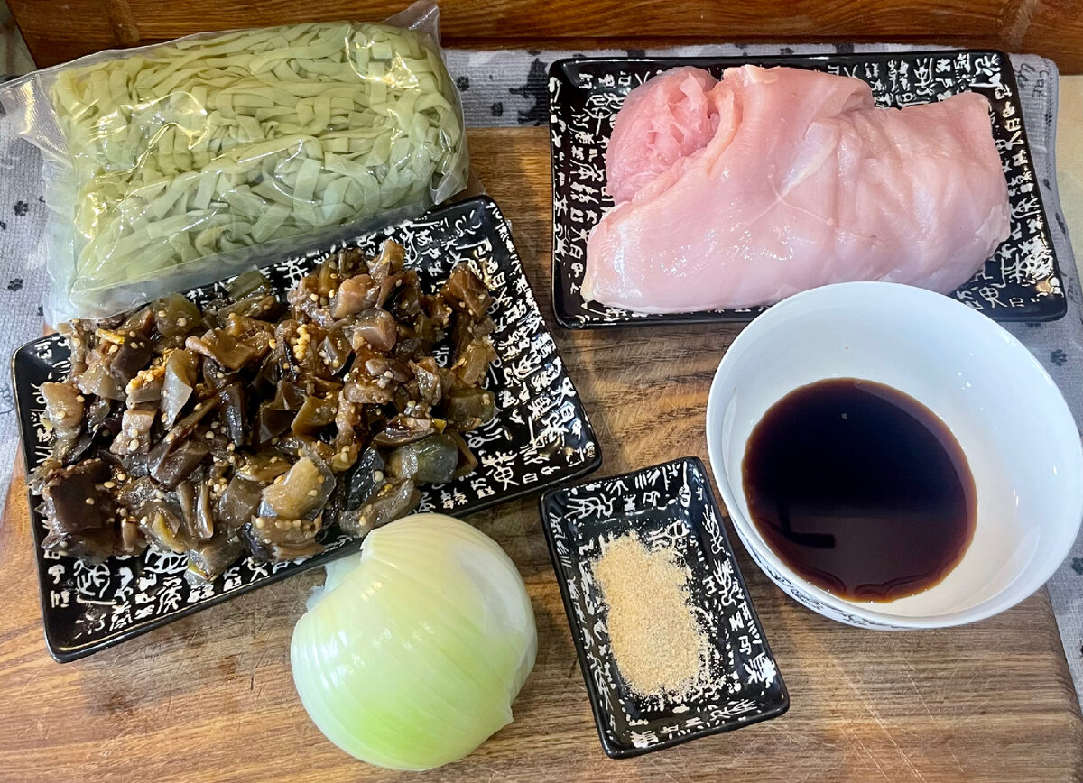 Сегодня попробуем лапшу ширатаки в ней всего 12 калорий на 100 грамм. У меня фетучини ширатаки со шпинатом, но можно взять любую другую (какая нравится или есть дома) Время приготовления 40 минут. Ингредиенты: -Лапша 500 гр -Куринное филе 400 гр -Баклажаны у меня уже жаренные из заморозки 230 гр. Если брать свежие то понадобится 400 гр -Лук репчатый 100 гр -Чеснок сушеный 5 гр -Соевый соус 50 мл -Перец черный по вкусу -Паприка красная (приправа) по вкусу 3. Лук полукольцами. 4. Баклажаны кубиком( если баклажан горчит его нужно посолить и оставить на пару минут, потом промыть водой. 5. Отправляем на разогретую сковородку курицу обжариваем до полуготовности. 6. Далее туда же отправляем лук, жарим пока он не станет прозрачным. 7. К курице и луку отправляем баклажаны, паприку, чеснок и молотый перец. Жарим 5 минут. Если пригорает можно добавить немного воды. 8. Вливаем соевый соус.Перемешиваем, убавляем огонь до среднего и ждём еще минуту. 9. Выкладываем на тарелку лапшу сверху ку