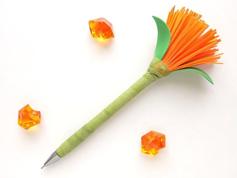 Оригинальное украшение можно сделать из фоамирана для шариковой ручки. В результате ваша канцелярия преобразится, ведь на каждой ручке появится свой цветок. Весь процесс изготовления такой поделки показан в нашем мастер-классе. Для создания такой ручки приготовим: Цветок на нашей ручке будет оранжевым. Поэтому из соответствующего фоамирана отрезаем полоску длиной около 20 см, а шириной 5 см. Предварительно ее удобно разметить с помощью линейки и зубочистки. Теперь нам потребуются ножницы. Начинаем ими выполнять частые разрезы с одной стороны оранжевой заготовки. Таким способом проходимся ножницами по всей длине полоски. Далее потребуется нагретый клеевой пистолет. Закрепляем край оранжевой полоски на кончике шариковой ручки. Затем начинаем наматывать эту полоску под небольшим углом. Требуется полностью намотать оранжевую заготовку на кончик ручки. Край после этого закрепляем горячим клеем. Из зеленого фоамирана вырезаем пару листочков. Аккуратно подкручиваем их с помощью ножниц. Прикле