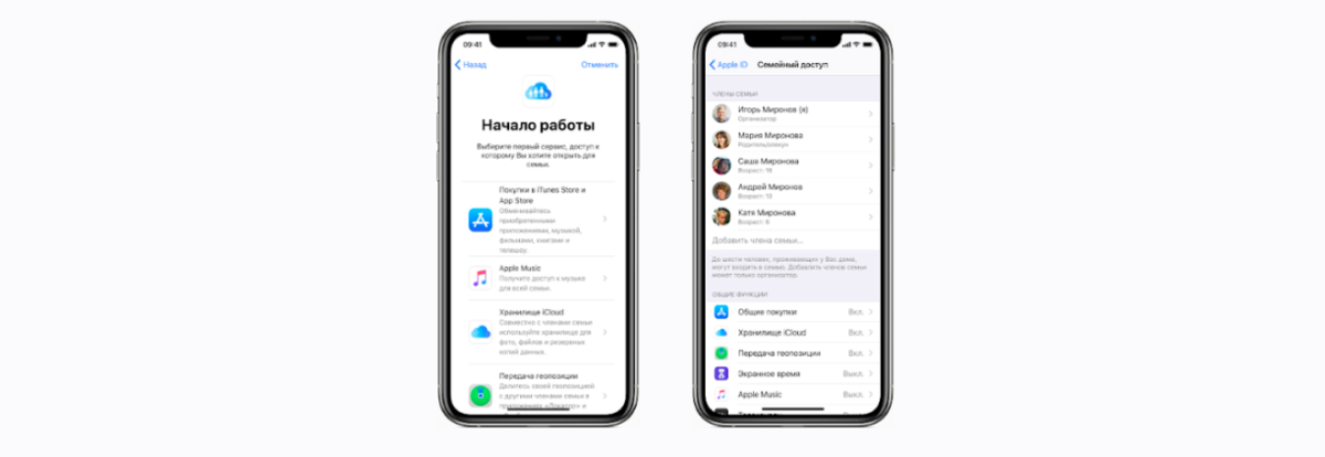 Функция «Семейный доступ» позволяет семье до шести человек использовать одну подписку на Apple Music, Apple TV+ и Apple Arcade. Кроме того, можно вместе пользоваться покупками из iTunes, приложения «Книги» и App Store, общим пространством в iCloud и семейным фотоальбомом. А ещё можно помочь друг другу искать потерявшиеся устройства.