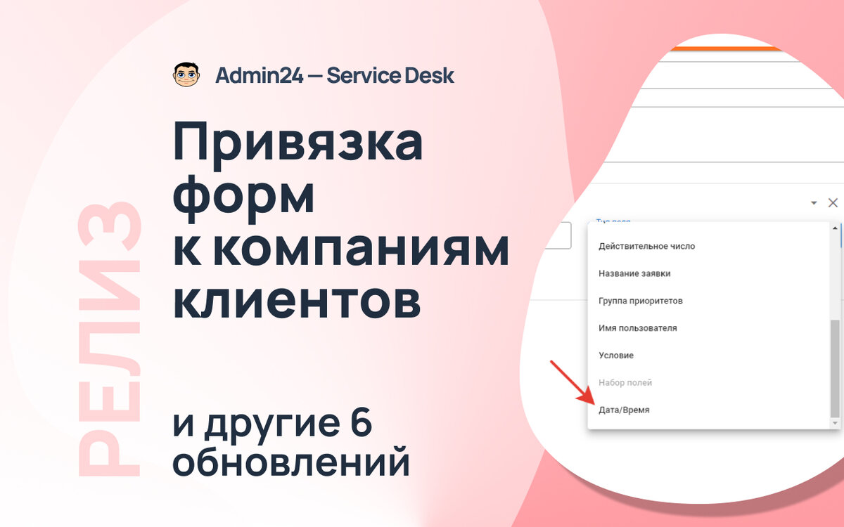 21 февраля вышла новая версия Admin24 – Service Desk. В рамках обновления разработчики добавили новые функции для пользователей: возможность добавить тип поля «Дата/Время» в форму, привязку форм к компаниям клиента, автоматическое создание контактов для компании и другие возможности. Добавление поля «Дата/Время» для формы В расширенный конструктор формы, который позволяет изменять стандартные поля, добавлен новый тип поля — «Дата/Время». Для клиента он представляет собой календарь с возможностью выбора даты и времени. Перейдите в раздел «Настройки», на вкладку «Формы». Откройте нужную форму и включите экспертный режим. Кликните на кнопку «Добавить поле» и в списке «Тип поля» найдите «Дата/Время». Привязка форм к компаниям клиентов Теперь можно указать, какие формы будут доступны для заполнения представителям клиента через их личный кабинет. Также добавлена возможность автоматически создавать контакт для компании при первом обращении, если такой контакт ещё не был заведён для данной ор