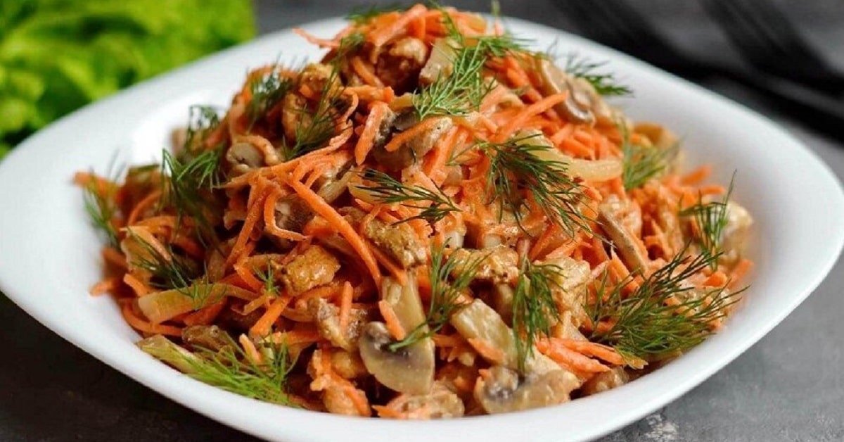 Моего мужа нельзя назвать привередой, но к еде у него есть особенные требования. Как человек практичный, он ценит сытность блюда, поэтому закуски без мяса не воспринимает вовсе. Учитывая его пожелания, я часто готовлю салат с корейской морковью, которым можно легко утолить голод. Это вкусная, сытная и очень интересная закуска. Наверное, именно поэтому салат со свининой и грибами называется «Верный муж»! Конечно, это шутка, но доля правды в ней есть. Благодаря умело подобранным ингредиентам закуска получается аппетитной, с легкой пикантностью. Вы потратите 20–30 минут на ее приготовление, но довольной останется вся семья. Как приготовить сытный салат «Верный муж» с корейской морковью В рецепте этого салата с мясом я расскажу, как приготовить корейскую морковь в домашних условиях. Поверьте, получается куда вкуснее, чем с покупной. Конечно, если у вас нет времени или специальной терки, можете приобрести готовую морковь в магазине. Кроме того, замариновать овощ можно заранее: за ночь морко