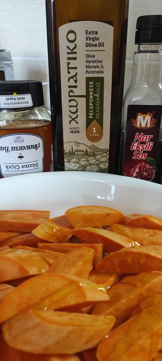 Всем привет! Сегодня я готовила батат с мëдом и небольшой кислинкой. Почистила и нарезала батат. Полила жидким медом, гранатовым соусом и оливковым маслом. Накрыла форму фольгой и отправила в духовку, разогретую до 160 градусов на час. Ещё у меня в блюдо случайно зашла половинка айвы, она придала дополнительный аромат. Через час форму вынула, содержимое перемешала, ещё раз немного полила мёдом и отправила в духовку на 7 минут немножко подрумяниться. Подавала со сливочным сыром.