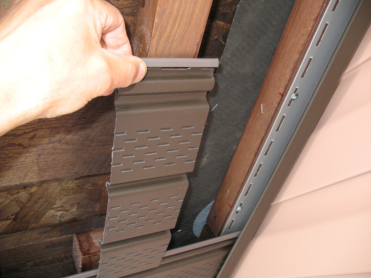 Софит монтируется между J-фаской и J-профилем. Возможны и другие комбинации с завершающими профилями, имеющими подходящий паз. Важно чтобы софит лежал свободно, никуда не упираясь, и в то же время не мог сместиться вбок и выпасть, а замок был надежно защёлкнут, и в замке был выбран зазор. Длина панели софита должна быть такой, чтобы легко входить между завершающими элементами, когда панель одни концом прижата к дну паза завершающего элемента (глубина паза + ширина проема между завершающими элементами). После того, как панель будет вставлена и защелкнут замок предыдущей панели, софит надо подтянуть вверх и зафиксировать от возможности смещения, ввернув два самореза в перфорационные отверстия так, чтобы исключить возможность перемещения. Фиксирующие саморезы ввертываются до касания со свободно лежащей панелью и затем слегка отворачиваются.