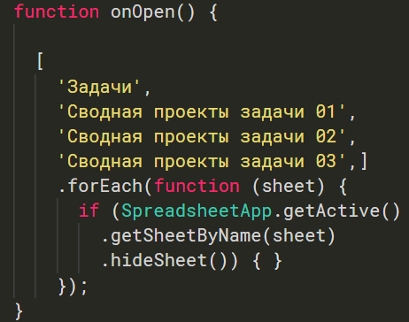 Нужно при открытии гуглтаблицы скрыть некоторые листы. Сначал написал так: var book = SpreadsheetApp.getActive();