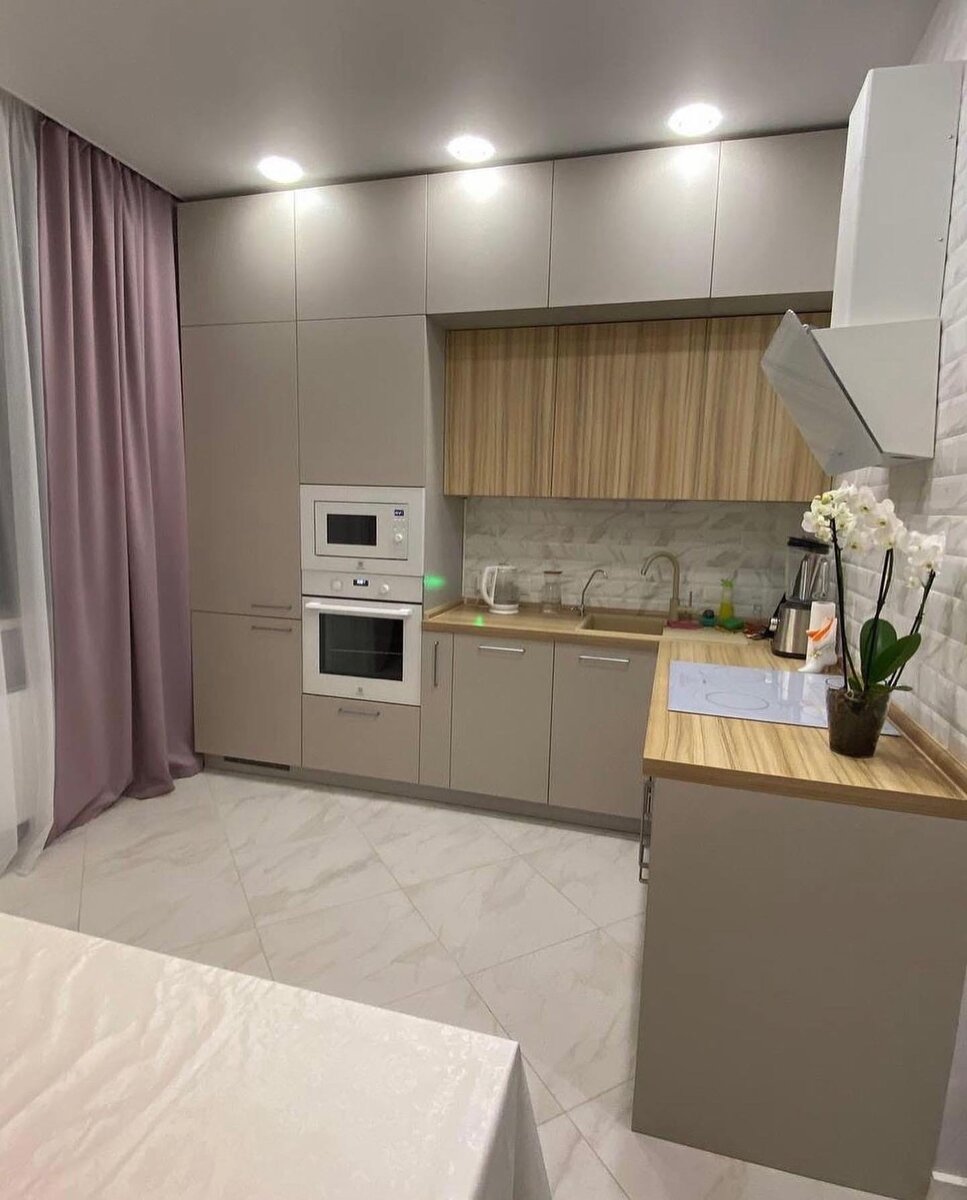 Клиенты просили создать теплую атмосферу, но с нотками современности... Атмосфера получилась 🔥🔥🔥 Встроили бытовую технику и интегрировали мойку из искусственного камня. Антресольный ряд оставили без ручек.