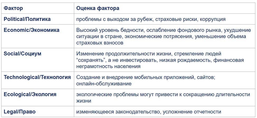 Все финансовые институты сталкиваются с различными видами рисков. Для выявления аспектов, влияющих на деятельность организации, используются различные инструменты. Так, например, для выявления политических, экономических, социальных и технологических факторов используется PEST-анализ. Нами был проведен данный анализ для выявления факторов, влияющих на деятельность пенсионных фондов. Были получены следующие результаты: Таким образом, мы понимаем, что пенсионные фонды сталкиваются не только с системными рисками, но и с другими видами рисков. Основным макроэкономическим риском является процентная ставка. Вопросы управления связаны в первую очередь с банками: основной доход кредитных организаций зависит от размера процентной маржи, при этом средние сроки активов и пассивов часто не совпадают. Непредвиденные расходы, связанные с изменением рыночных процентных ставок, являются реализацией процентного риска. Процентный риск присутствует не только в деятельности банков, но и некредитн