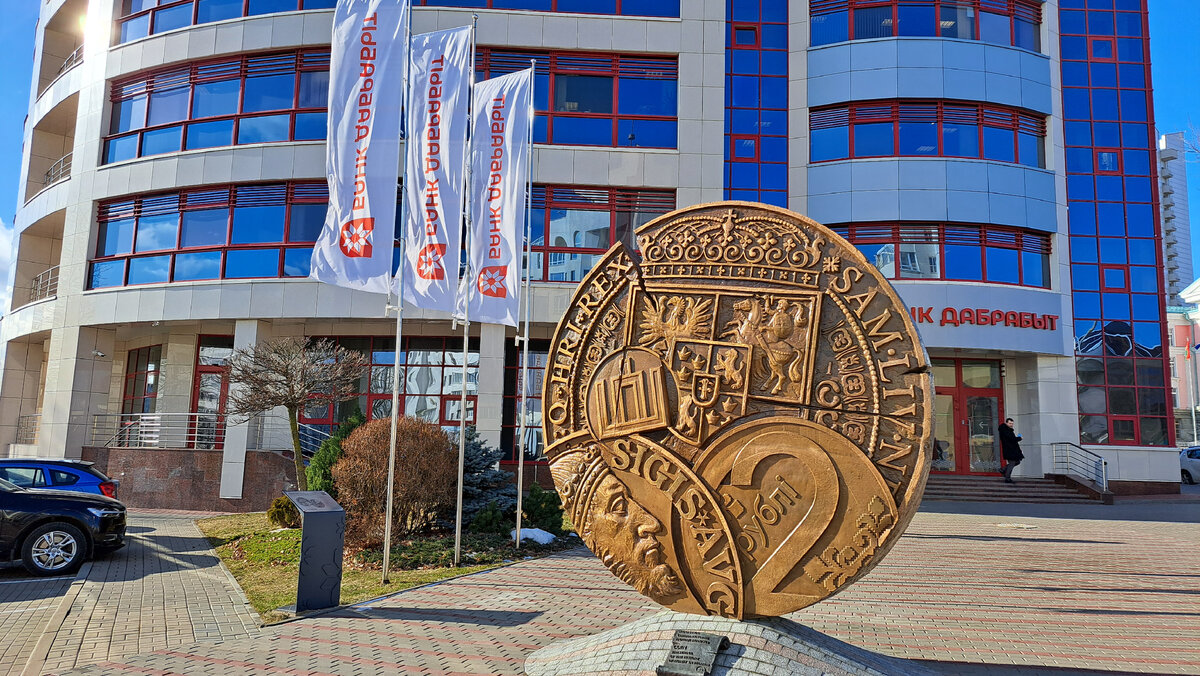 Не так давно в центре Минска появилась скульптура "Монета" . Ее установили в центре на Коммунистической улице рядом с «Банком Дабрабыт». Скульптура олицетворяет разные исторические этапы в развитии страны. В скульптуре отражены денежные знаки, которые были в обращении на территории современной Беларуси с древних времен до настоящего времени- всего 10 монет. Среди них: арабский дирхем 9-го века, серебряный пенязь Витовта начала 15-го века, монеты конца 14-го века, дукаты 16-го и 19-го веков, талер 17-го и 18-го веков. В композиции присутствуют также советские 10 копеек и современные 2 рубля.