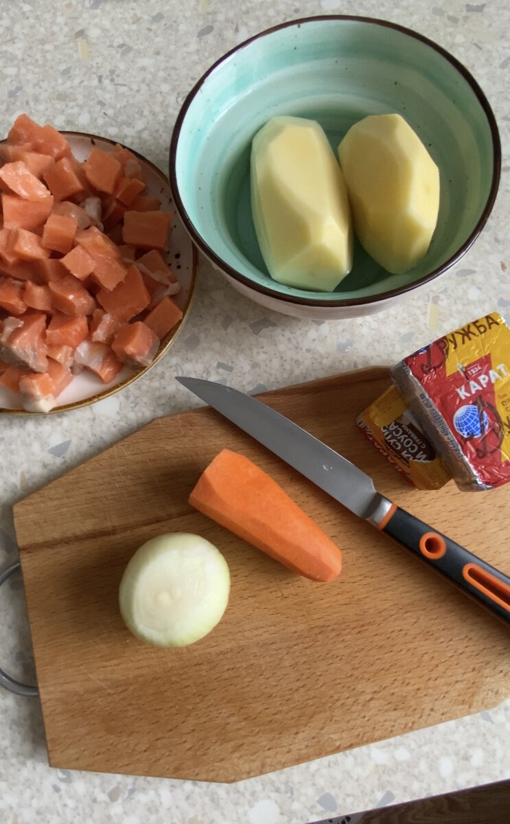 Хочется приготовить что-то по-быстрому, не заморачиваясь и в тоже время, чтобы было вкусно? Легко! Этот быстрый суп занимает максимум полчаса времени приготовления и минимум продуктов. Для него тебе понадобится: Все ингредиенты нарезаем кубиками. Форель предварительно очищаем от шкурки и костей. Ставим кастрюлю на газ и пока вода будет закипать, делаем зажарку из лука и моркови. Как только вода в кастрюле закипела, солим её по вкусу и отправляем в кастрюльку готовую зажарку, картофель и лавровый лист. Даём всему этому закипеть и только тогда убавляем газ и варим картофель до полуготовности, это примерно 3 минуты. Затем добавляем плавленый сыр. Тщательно перемешиваем всё до полного растворения сыра и затем добавляем в суп рыбку. Добавляем огонь и даём ещё раз всему этому закипеть. Как только всё закипело, убавляем газ и варим на среднем огне ещё 5-7 минут, затем выключаем. Вкусный и быстрый суп готов. Приятного аппетита. P.S. такое количество продуктов на 3-3,5 литра воды.