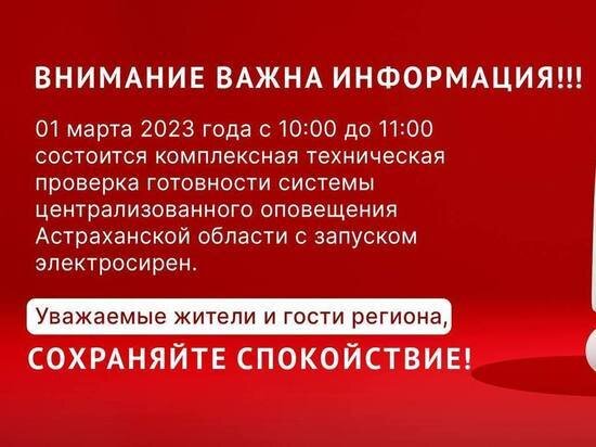 В Астрахани 1 марта проведут комплексную техническую проверку системы оповещения. В городе будут звучать сирены, громкоговорители. Также по телевидению и радио будут появляться информационные сообщения. Начало запланировано на 10:42 по местному времени. Автор: Редакция «МК в Астрахани»
