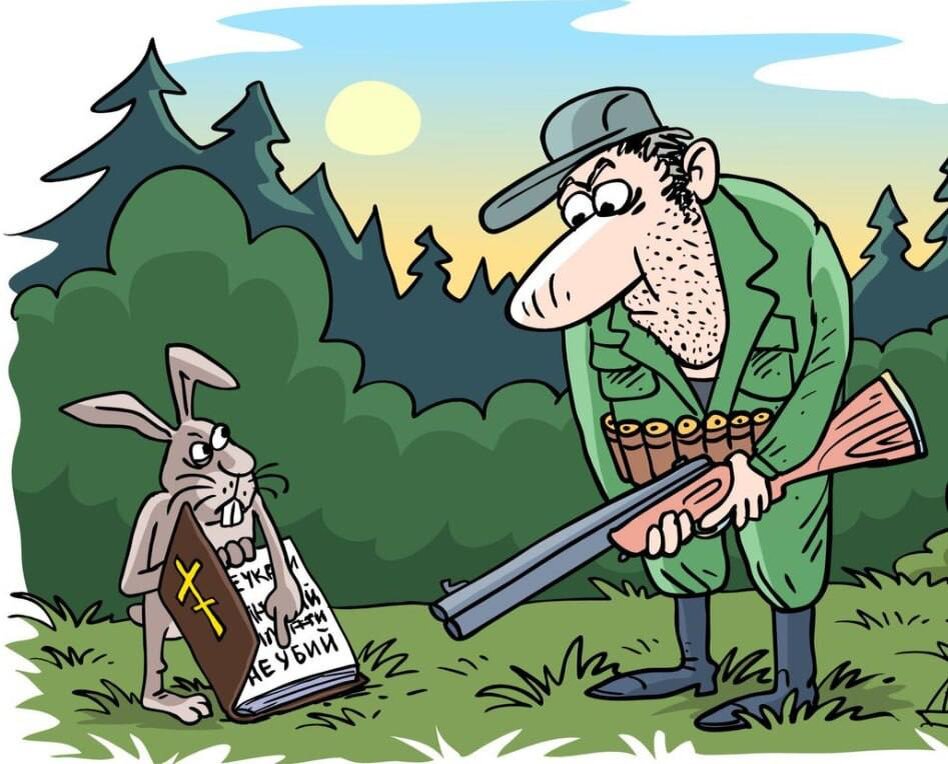 А там Бог в наказание за кровь невинно убиенных животных превращает его самого в зайца и отправляет обратно на землю. Через некоторое время заяц попадает в капкан, а еще через некоторое время туда приходит охотник, который его поставил. Заяц охотнику: — Отпусти меня, может быть, ты мне не поверишь, но я сам в своей прошлой жизни был охотником! — Тем хуже для тебя, дружок: я в своей прошлой жизни был зайцем!