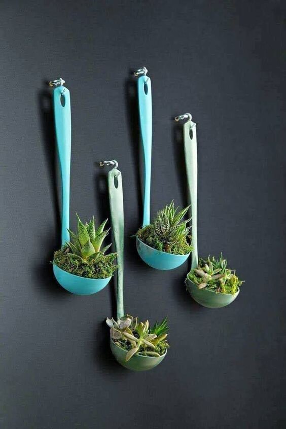 Каждый раз, поливая свой небольшой домашний сад, я думаю о том, как здорово растения оживляют наши интерьеры. Особенно приятен такой зеленый друг в городе, где так часто не хватает природы. Знатоком садоводства я себя назвать не могу, а вот красивые и необычные решения для дома очень люблю. В который раз полезла в сеть в поисках идей красивых «домиков» для моих зеленых друзей. Честно говоря, поначалу искала в магазинах необычные дизайнерские кашпо, но цены на многие из них кусаются... Тогда я решила прибегнуть к проверенному методу и посмотреть, что придумывают творческие фантазеры! Нашла массу необычных и интересных идей! Оказалось, не обязательно даже что-то покупать, интересные кашпо можно сделать из того, что давно пылится дома: чашек, чайников и даже туфель! Вот какие идеи я взяла на вооружение. 1. Старые поварешки Вот такие необычные кашпо-подвесы можно сделать из простых привычных поварешек! Конечно, эта идея для маленьких цветов, которые к тому же не требуют частого полива или