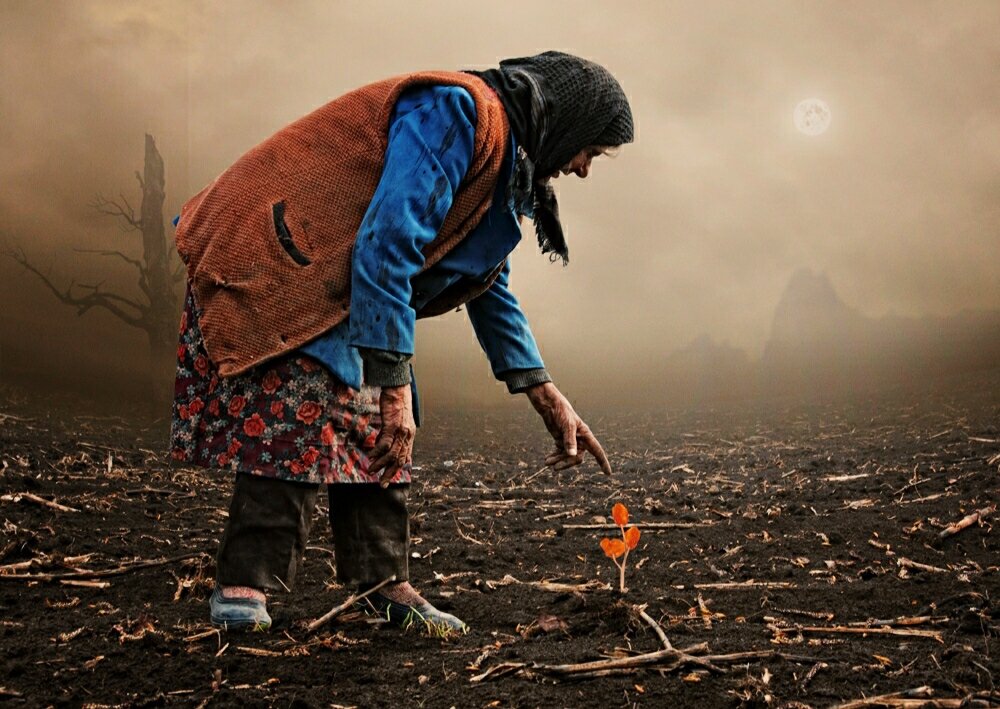 По пепелищу бродили старушка и мальчик. Старушка собирала пепел в мешок. Саша сделал несколько фотографий.