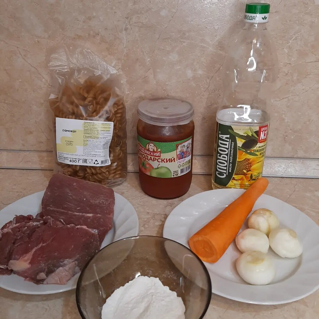 Нам понадобиться: • говядина, мякоть (немного с жирком, но не обязательно) - 500 г. • морковь - 1 шт. • луковицы средние - 2 шт. (можете взять 4 маленькие, как у меня) • томатная паста - 150 гр. • растительное масло - 100 мл. • мука пшеничная - 2 ст.ложки • соль и перец по вкусу Что необходимо сделать: - нарезаем мясо кубиком (1,5 - 2 см) - на хорошо разогретую сковородку с растительным маслом (сковорода должна быть глубокая), выкладываем кусочки мяса, постепенно. Мясо должно хорошо обжарится, а не варится в своём соку. - пока мясо жарится, нарежьте кубиком лук и морковь. Кубики должны быть примерно одинаковые. - когда мясо хорошо схватилось, отправляем к нему лук и морковь, и немного обжариваем. - добавляем томатную пасту и ещё немного обжариваем (главное, что бы лук и морковь не превратились в пережарку) - заливаем всё кипячёной водой, что бы покрыло обжарку. Солим, перчим, доводим до кипения, убавляем огонь до минимума, и оставляем тушиться примерно 1 час. Если необходимо, период
