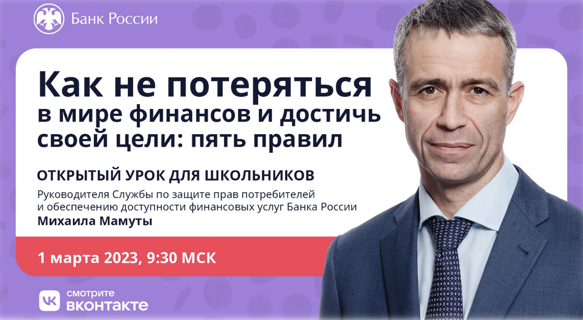 1 марта 2023 года в 8:30 по местному времени начнется онлайн-урок руководителя Службы по защите прав потребителей и обеспечению доступности финансовых услуг Банка России Михаила Мамуты «Как не потеряться в мире финансов и достичь своей цели: пять правил». В сообществе регулятора «ВКонтакте» можно будет задать вопросы спикеру. Урок даст старт всероссийской онлайн-олимпиаде по финансовой грамотности, которая продлится до 31 марта. Учащиеся с 1 по 9 класс смогут узнать ответы на самые важные вопросы: как разумно распоряжаться карманными деньгами, планировать покупки и уберечься от мошенников. Впервые в олимпиаду включены задания по страхованию, а также по достижению финансовых целей. Школьникам, например, предложат накопить деньги на подарок близким. Также участники олимпиады смогут попробовать себя в роли предпринимателей: открыть виртуальное предприятие, закупить для него оборудование, продумать ценообразование, продвижение и клиентский сервис. По итогам каждого этапа предусмотрена обра
