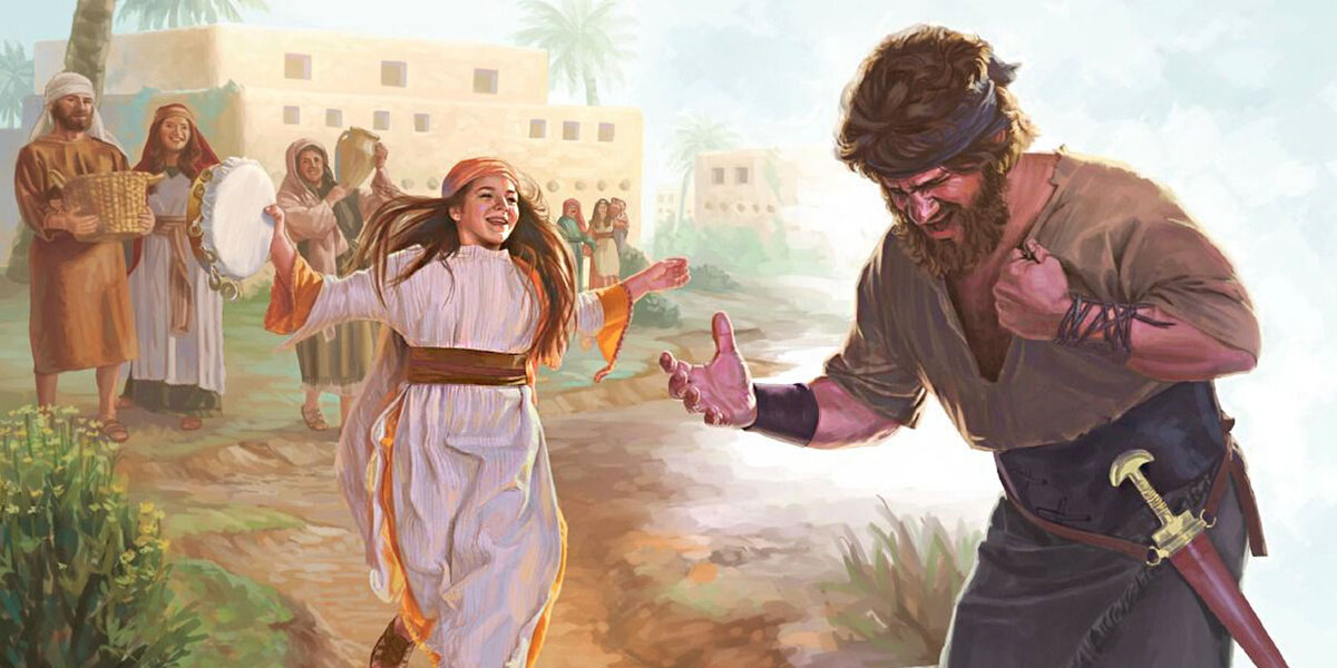 Библейская история этого героя начинается так: И дал Иеффай обет Господу и сказал: если Ты предашь Аммонитян в руки мои, то по возвращении моем с миром от Аммонитян, что выйдет из ворот дома моего навстречу мне, будет Господу, и вознесу сие на всесожжение. (Сд.11:30,31) Вот что произошло после победы: И пришел Иеффай в Массифу в дом свой, и вот, дочь его выходит навстречу ему с тимпанами и ликами: она была у него только одна, и не было у него еще ни сына, ни дочери. Когда он увидел ее, разодрал одежду свою и сказал: ах, дочь моя! ты сразила меня; и ты в числе нарушителей покоя моего! я отверз [о тебе] уста мои пред Господом и не могу отречься. (Сд.11:34,35). И сказала отцу своему: сделай мне только вот что: отпусти меня на два месяца; я пойду, взойду на горы и оплачу девство мое с подругами моими. Он сказал: пойди. И отпустил ее на два месяца. Она пошла с подругами своими и оплакивала девство свое в горах. По прошествии двух месяцев она возвратилась к отцу своему, и он совершил над нею