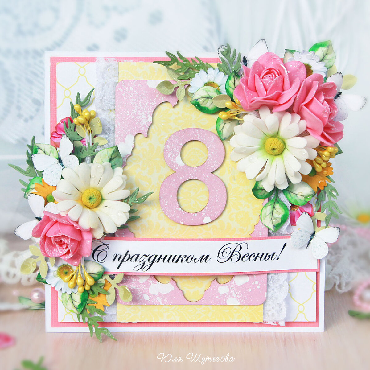 Перед вами солнечная открытка с ромашками и розами ручной работы, приуроченная к весеннему празднику - 8 Марта! Ее размер 13х13см Открытка выполнена в яркой, теплой цветовой гамме: белый, розовый, зеленый, желтый.