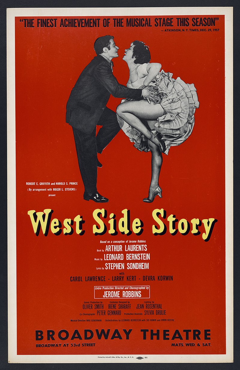 26 сентября 1957 года в Winter Garden Theatrе на Бродвее был представлен новый мюзикл, "Вестсайдская история". Он повествовал о борьбе двух преступных группировок на улицах Нью-Йорка... и любви двух молодых людей, принадлежащих к к ним. Новое прочтение шекспировских "Ромео и Джульетты" создали прославленный композитор и дирижёр Леонард Бернстайн, автор песенных текстов Стивен Сондхайм и драматург Артур Лорентс. Постановщиком действа стал хореограф Джером Роббинс.