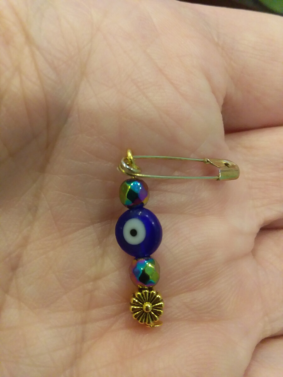 - Если вы носите этот оберег на виду, его цель- перехватить и отвести взгляд. Здесь расчёт на простое любопытство, особенно женское. Женщина должна отвлечься на эту булавочку и преломить свой негатив на любопытство. Чтобы привлечь внимание нужно что- то сияющее, переливающееся. В своих булавках я использовала для этой цели разноцветные гранёные бусинки гематита. Этот минерал не только сверкает, но и является мощным щитом, отражающим дурной глаз. Кроме этого он способен улучшать кровоснабжение и снижать артериальное давление. Булавку от сглаза применяют в нашей культуре, а в Турции для этого используют изображение глаза. Я его тоже прикрепила, поскольку мы живём в многонациональной стране. И, наконец, цветок или солнце, как символ света и возрождения.