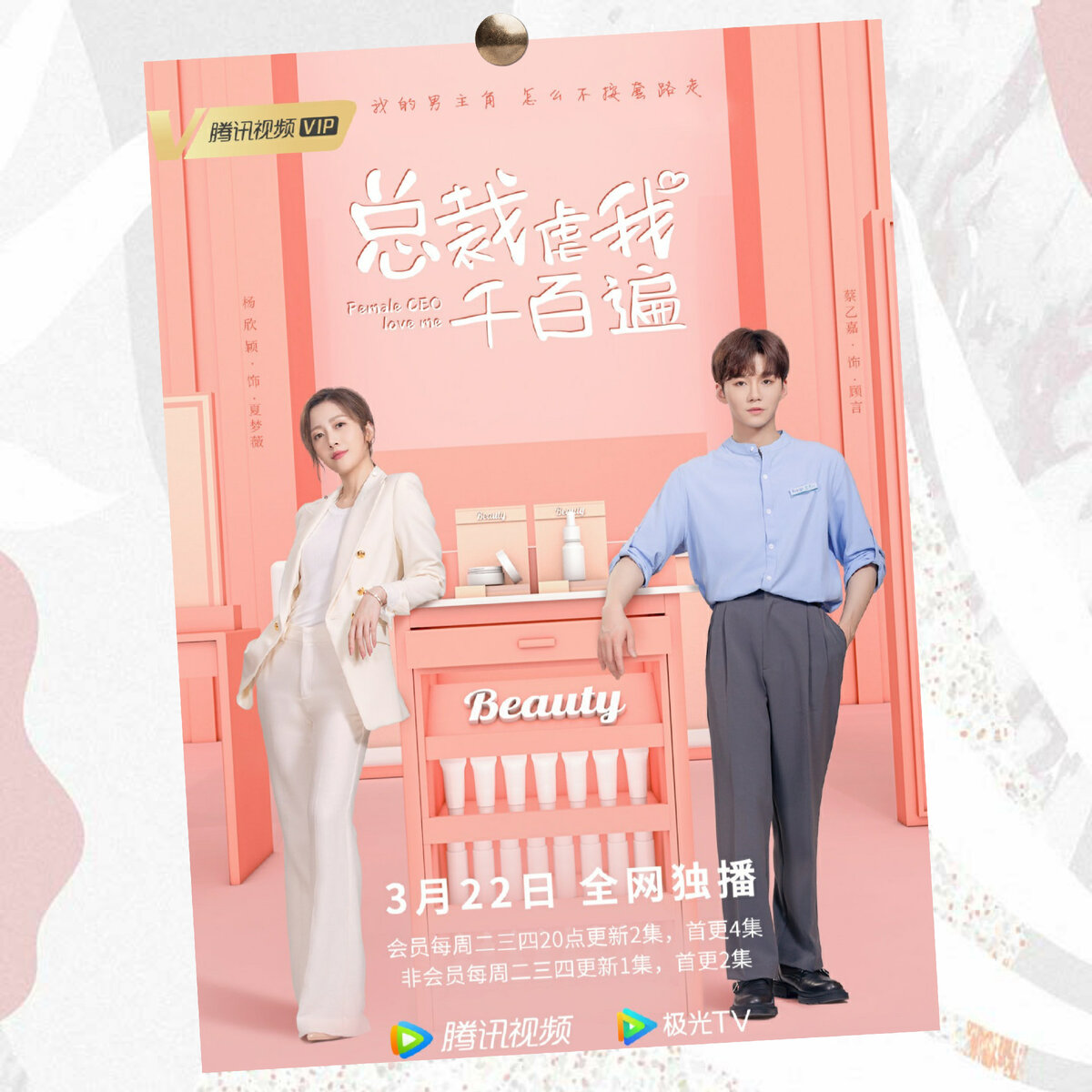 Если у вас совсем нет времени, но хочется посмотреть что-то легкое и романтическое, то китайская мини дорама «Начальница любит меня» 2022 года вполне может подойти вам. История о Ся Мэнвэй (Ян Синь Ин) - женщине, управляющей торговым центром, и которая влюбилась в сотрудника косметического магазина - Гу Яня (Цай И Цзя). Она всячески добивается его, но тот непреклонен и делает вид, что не реагирует на ее чувства. Но зритель довольно быстро понимает, что это не совсем так.😏 Он постоянно встаёт на ее сторону и всячески пытается оберегать. Она же в ход пускает самые смелые свои фантазии. Дорама целиком построена на том, как героиня придумывает очередной способ добиться возлюбленного. То к советам друга прибегнет, то в "правильной" книге подсмотрит. В ход идёт всё. В какой-то момент даже "третьего лишнего" подключила. Но только их оказалось больше, чем предполагалось. Из-за чего ее попытка вызвать ревность чуть было не провалилась.😅 Могу сказать, что искренне жаль мне было только одного "