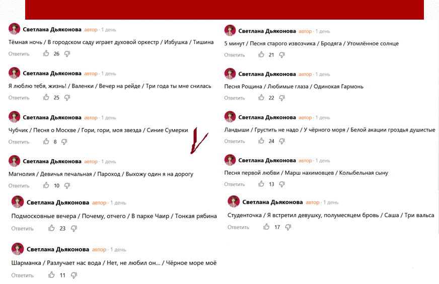 Всё, что касается нашего мини-проекта, я складываю в подборку. Кому интересно, можно ознакомиться тут: А сейчас посмотрим, о каких песнях мы сегодня будем беседовать. Те, которые набирают меньше голосов, не проходят в следующий тур нашего голосования. Чубчик Галина Веретенникова: Хотелось бы вспомнить песню "Чубчик". Всегда считала, что автор и исполнитель её П. Лещенко. Решила свериться в интернете и на долгие часы потонула в интереснейшей информации. Всё пересказывать не стану, скажу лишь, что до того, как в 1933 году её записал П. Лещенко, в 1930 году её записал уже Юрий Морфесси (понравился мне более всего!!!!!!). В 1927 году песню спели Муня Серебров и Давид Медов (на пластинке авторы песни не указаны), и как утверждают музыкальные эксперты, есть пластинки от 1924 года от Веры Смирновой с "женским вариантом" песни. Непонятной остаётся дата написания песни, да и ав