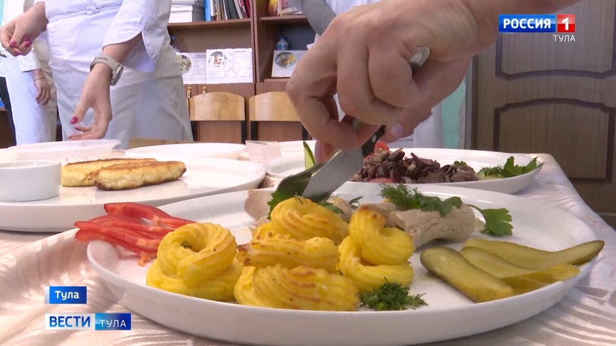 Сосиски в тесте забыты, пюрешка с котлетой временно не актуальны, а вместо них – семга и брускеты. В Туле школьные повара соревновались в том, кто лучше всех готовит на конкурсе «Лучший по профессии». В финальный этап прошли 4 повара – 2-е из них работают в Туле, а двое других в Богородицке и Головеньках. На суд жюри каждый из претендентов должен был представить авторские горячие блюда, салаты и закуски. В школьных столовых такое невозможно по нормативам детского питания, но здесь полет творческой фантазии участников ограничивался только временными рамками: на приготовление блюд отводилось 3 часа. Заведующая производством в школьной столовой центра образования N 42 г. Тулы Оксана Атрощенко: «Это салат закусочный. Тут ветчина, курица, сыр, яйцо, майонез, который не положено использовать в школе. Приглашение поступило внезапно, я не была к этому готова. Хочется научиться работать на скорость, быстро. В школе мы готовим иначе». Эта закуска, видимо, стала главным блюдом вечера, ведь именно