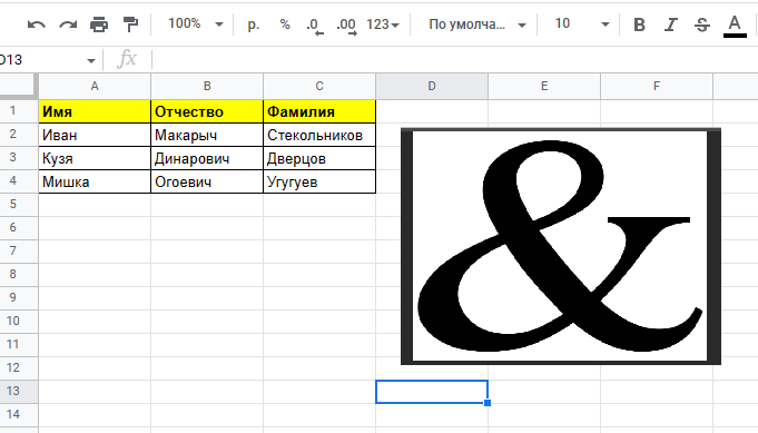 Работа в excel связана с применением различных функций, в том числе с функцией СЦЕПИТЬ (другие вариации - это амперсанд, союз "и", СЦЕП и т.д.). Ниже в этой статье покажу на простом примере в excel как применять значок амперсанд (& - выглядит так на клавиатуре). Допустим, у нас есть некая таблица в которой 4 строки и 3 столбца (Имя, Отчество и Фамилия): Пришла задача сделать дополнительный столбец справа, который будет называться Полное ФИО.