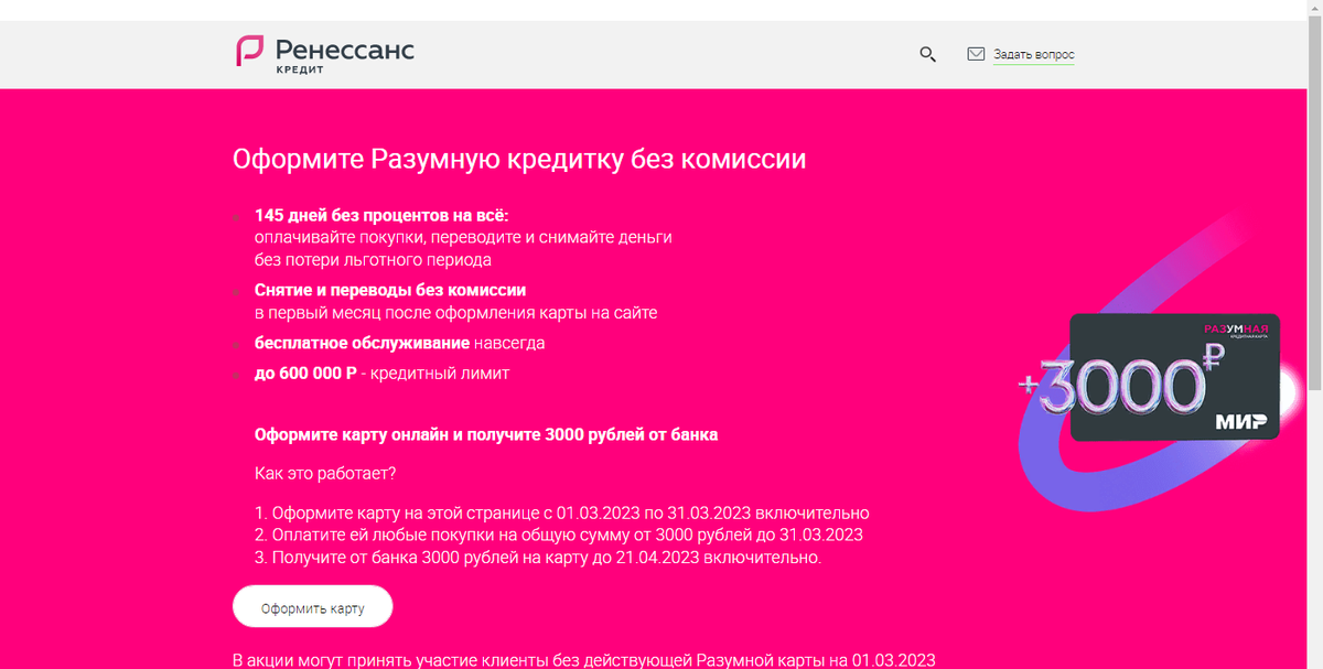 3000 ₽ублей (100%) кешбэк ПОКУПКИ , ЖКХ 145 дней без % Бесплатная НАВСЕГДА Кредитная карта Разумная до 600 000 ₽ублей от Ренессанс Кредит Банк ОФОРМИТЕ-ОНЛАЙН В МАРТЕ 2023 г. + Бесплатная доставка