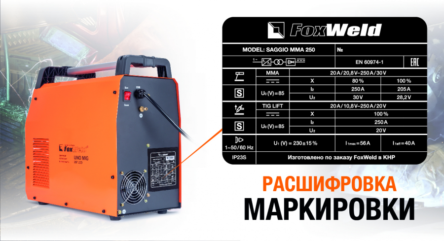 На всех технически сложных устройствах, к которым относится и сварочное оборудование, указаны основная техническая информация и параметры работы. Эти данные находятся в табличке, выполненной в виде наклейки или металлической пластинки, которая размещается на корпусе аппарата. Но далеко не всем понятна указываемая там информация. О том, что же скрывается за различными символами, буквами и цифрами, содержащимися в паспортных табличках оборудования для сварки, мы покажем на примере маркировки сварочного полуавтомата от компании Foxweld – Invermig 350 Compact. Расшифровка паспортной таблички сварочного полуавтомата 1. Торговый знак 2. Модель 3. Указание на соответствие аппарата стандартам EAC 4. Символ источника питания 5. Стандарт, по которому изготовлено сварочное оборудование 6. Символ процесса сварки 7. Символ постоянного тока 8. Номинальное напряжение холостого хода 9. Диапазон мощности сварки, минимальный и максимальный сварочны