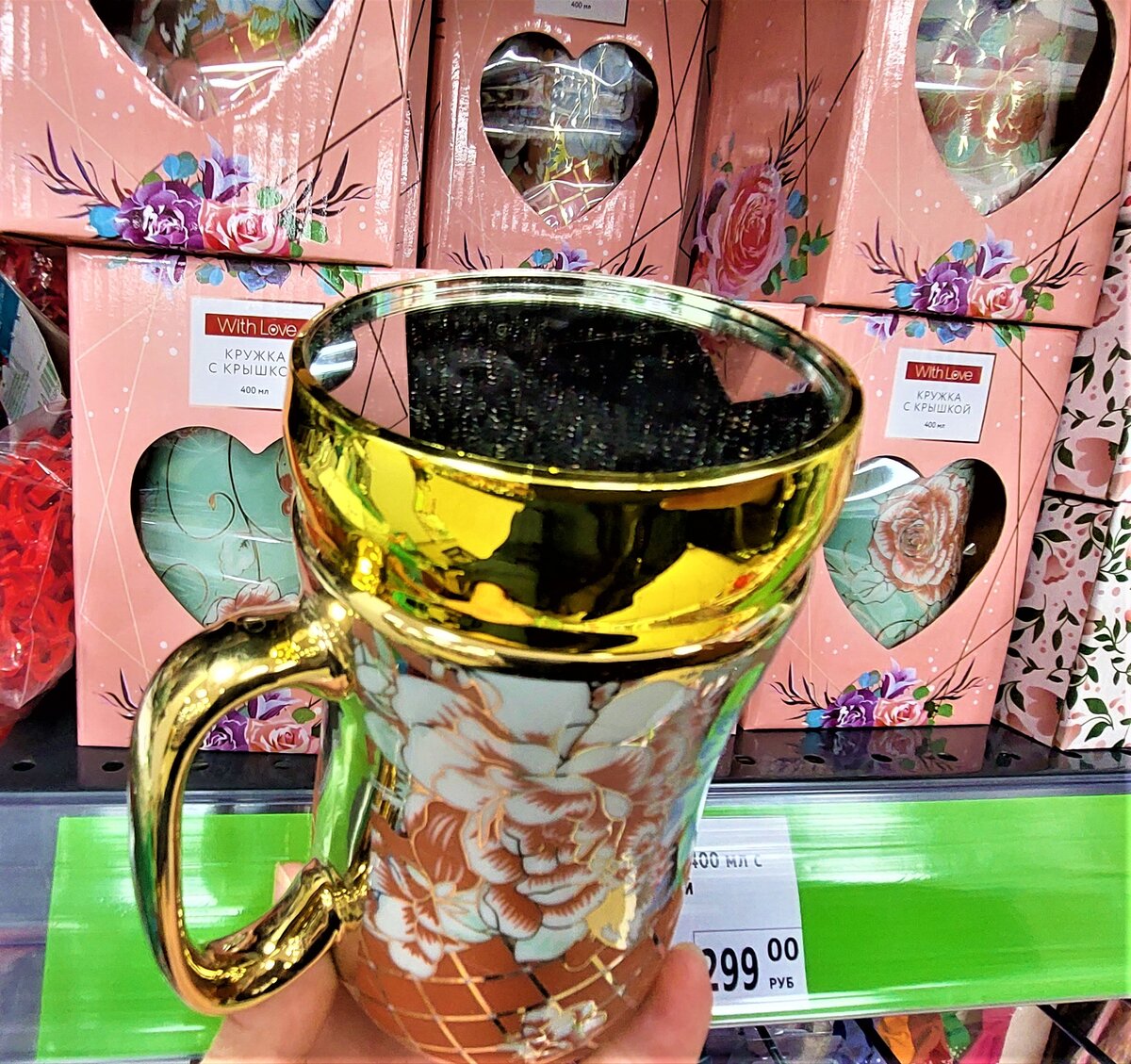 Кружка с крышкой, With Love, отличный подарок на 8 марта с цветочным узором и позолотой, крышка позволит дольше сохранять тепло. Объем 400 мл. Состав: фарфор, полипропилен, стекло, силикон, 299 руб.