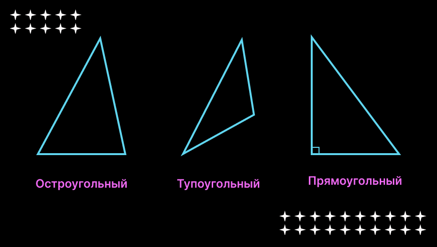 Треугольник — фигура, которая состоит из трёх точек, не лежащих на одной прямой, и трех отрезков, попарно соединяющих эти точки. Отрезки называются сторонами треугольника, а точки — его вершинами. Какие бывают треугольники Треугольники делят по градусной мере углов, а также по количеству равных сторон в треугольнике. Линии треугольника Высота — перпендикуляр опущенный из вершины треугольника на противоположную сторону или её продолжение для тупоугольного треугольника. Буквой Н обозначают точку, которая является частью высоты и лежит на стороне треугольника. Биссектриса — луч, исходящий из вершины угла и делящий этот угол на два равных угла. Как правило буквой К, называют точку, которая лежит на стороне треугольника и лежит на биссектрисе. Медиана — это отрезок который соединяет вершину треугольника с серединой противоположной стороны. Обычно точку которая лежит на стороне треугольника и является частью медианы, обозначают буквой М. Средняя линия — это отрезок, соединяющий середины двух