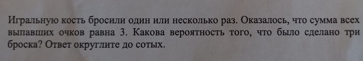Допустим, кроме всех этих условий, говорится о том, что подбрасывали кубик три раза, сумма очков должна быть 7, но грань с шестеркой ни разу не выпадает.