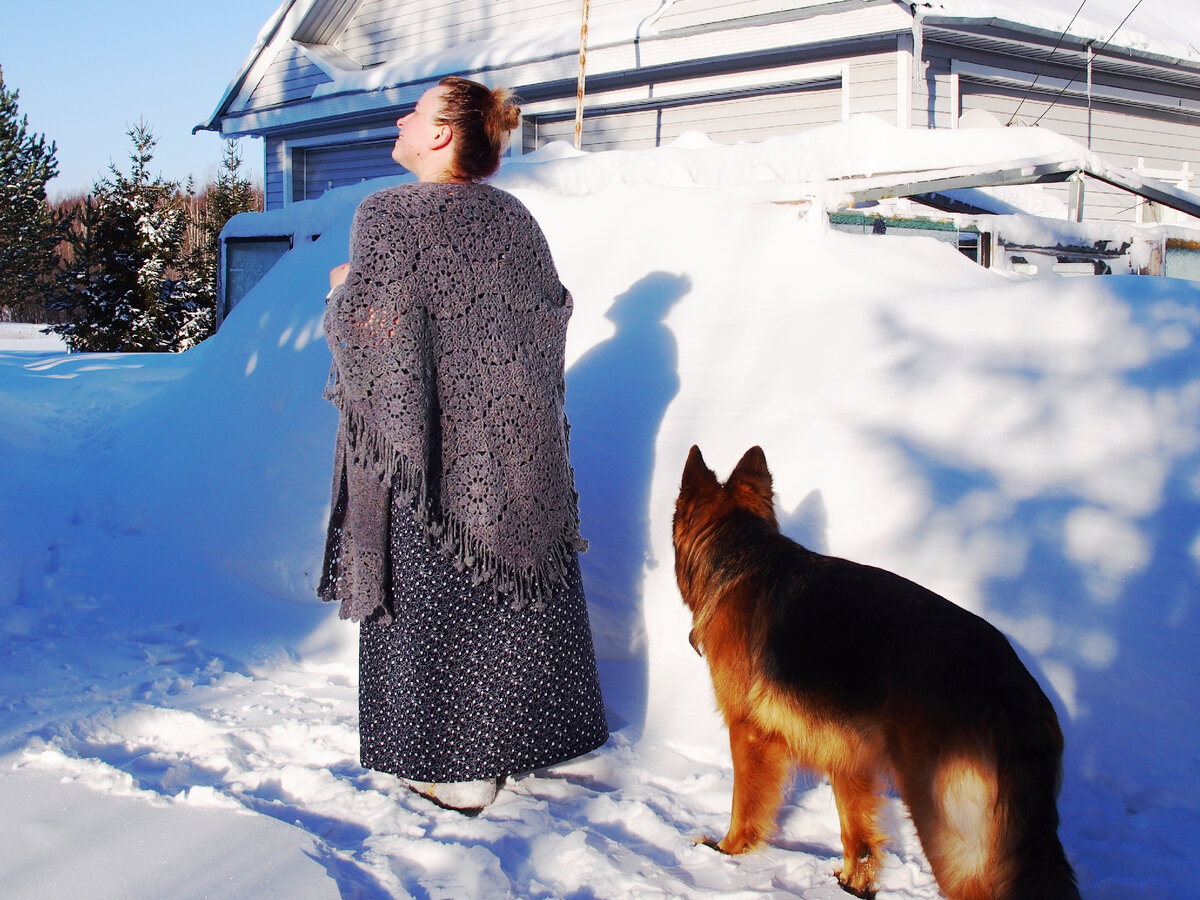 Но шаль прекрасно лежит на плечах и не норовит соскользнуть под собственной тяжестью, как это часто случается с шалями треугольной формы или обычными прямоугольными палантинами.