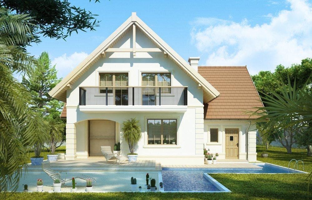 В левом крыле расположен гараж для одного автомобиля и топочная, а справа – прямоугольный эркер.