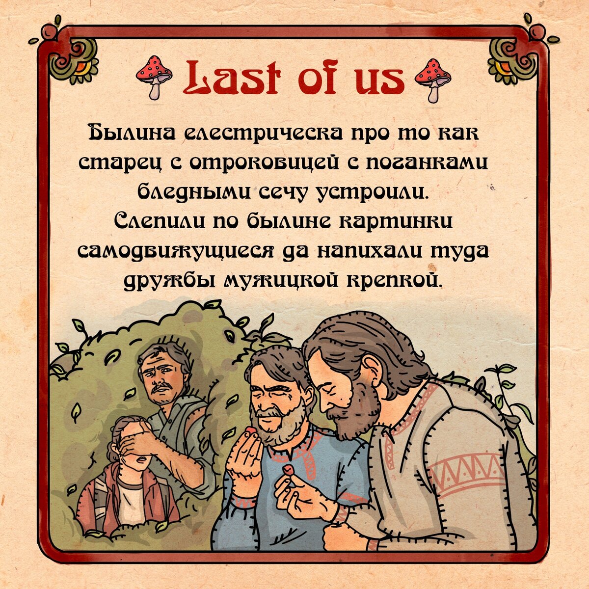 Уже через пару дней, 12 марта, состоятся премьера финальной серии первого сезона сериала «Одни из нас» - экранизации известной видеоигры, разработанной компанией Naughty Dog. Сериал уже успел вызвать много споров и обсуждений, но многие поклонники игровой серии сходятся на том, что экранизация получилось очень близкой к оригиналу. И как и любой другой громкий инфоповод, новый сериал вдохновил многих художников на творчество, так что в этой статье я решил собрать несколько зарисовок про The Last of Us. В группе Интернетъ по-русски можно найти шутливое определение практически любому персонажу или понятию, которое становится популярно в сети. Авторы проекта рисуют забавные иллюстрации о кино, мемах, известных личностях, при этом сопровождая их ироничных тексами. Основная фишка проекта - стилизация под старину, причем речь как о рисунке, так и о тех самых текстовых определениях. Сериалу The Last of Us вот тоже досталось. Учитывая, что сюжет сериала «Одни из нас» не является оригинальным, а